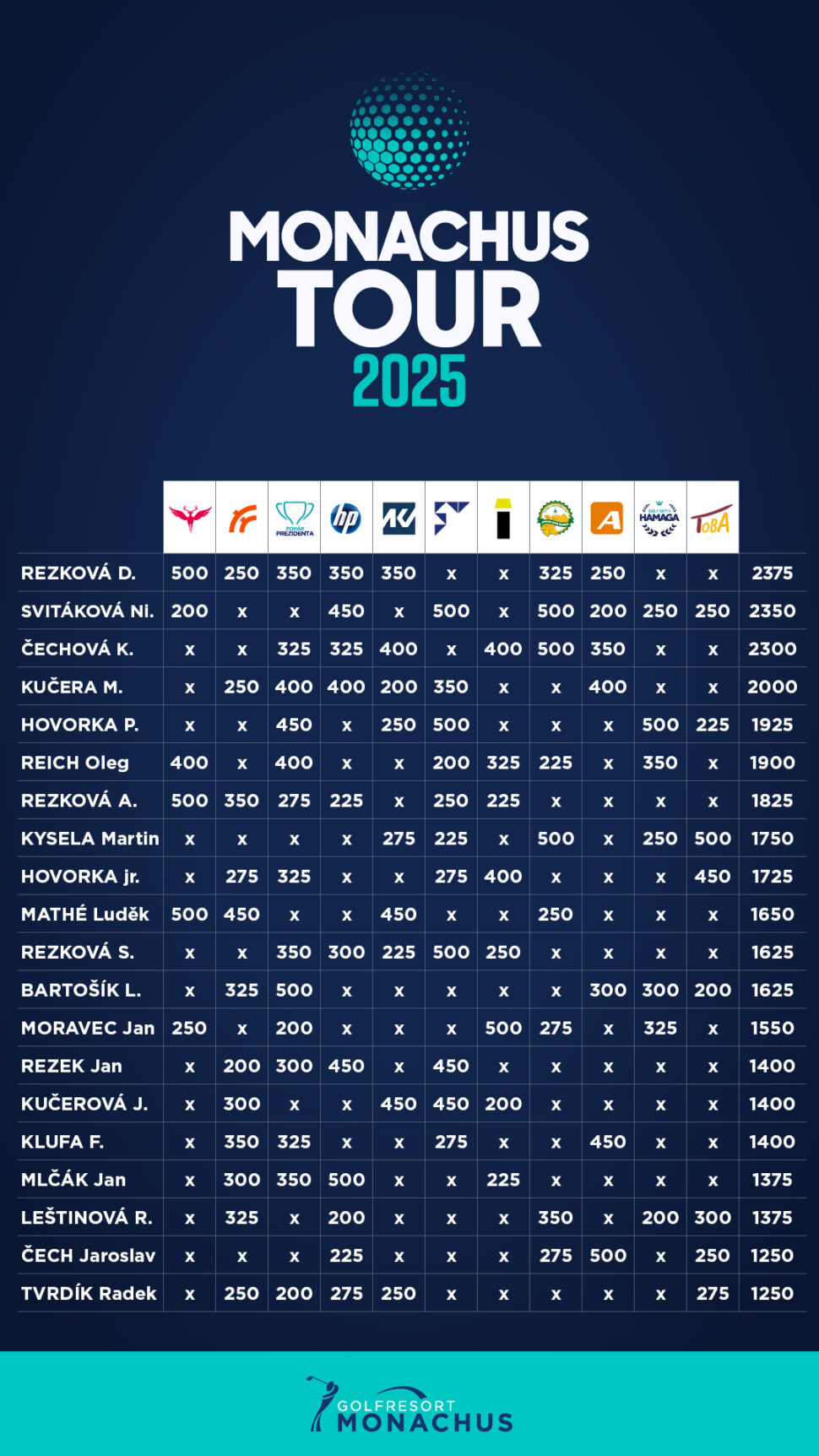 Celkem během sezóny odehrajeme 9 turnajů. Každý turnaj je pořádán pod záštitou jednoho z partnerů, kterým samozřejmě velice děkujeme.
